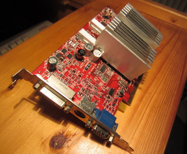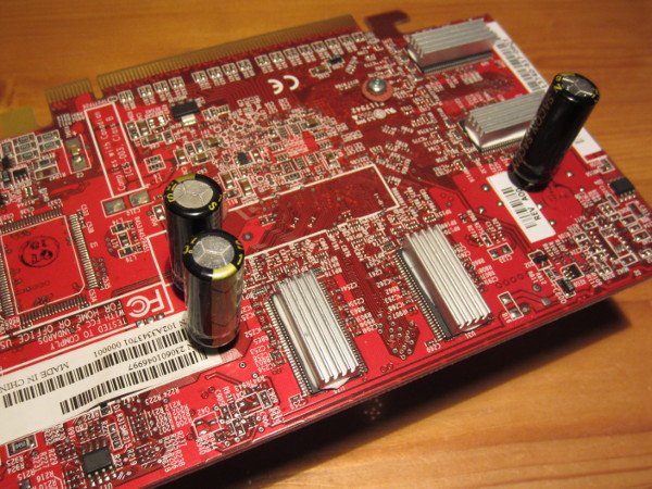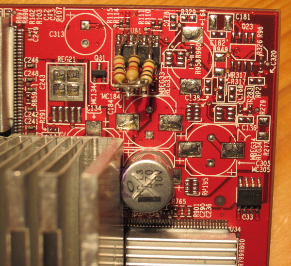 On many occasions where systems get upgraded older parts get left over. These are either traded ,binned or reused for other purposes. Now if you're like me, you'll want to find a new purpose for every old parts left. When a friend of mine asked me to upgrade his old Dell computer i inherited his old 'beast' of a videocard. Here are some specs of the 'beast': Core: RV370 @ 400mhz Mem: 128MB DDR @ 250(500)mhz ![]() Dell's near identical X600XT version (which isn't XT at all) It was only used for the memory, but i never quite understood LM324 setups, so this time it just offended me. Got me angry in the right kind of way. "This time i will properly mod an LM324 and understand the principal workings so i can do it again someday!" Also i didn't want to ruin the silent experience i was enjoying from this card so i decided it would need better cooling if i was to increase the voltages. Luckily i didn't bin parts that did not get new purposes right away ;)Whenever you are overclocking something you will generate more heat which will need to be removed from the source as quickly as possible. Usually a bigger fan or a bigger heatsink will do and in extreme cases water. I wasn't aiming for anything extreme here but i didn't want to resort to any screaming fans so a bigger heatsink would be needed. Also the memory would probably get hot under load so better address this too. Here is how the card looks after the modifications: ![]() If you're not the DIY type you can of course always resort to the after market solutions. Memory Voltage As mentioned the memory voltage is governed by the LM324 chip. Usually we he have a plain voltage regulator or a PWM to deal with, which are easily modified using the FB pin or in case of a regulator the ADJUST pin. An LM324 circuit is not that different from a voltage regulator but without any protection circuits and much less elegant. They are usually quite clumsy to measure, additionally it has 4 channels which in effect are 4 independent regulators. The LM324 pinout Now you can see the 4 op-amps inside the LM324. 'As is' the LM324 has nowhere near enough power to run all those DDR chips on it's own, that's why they are always coupled to an output transistor which increases the output power. ![]() A simple regulator with increased power trough Q1 Now notice the feedback line to the LM324, this is what were looking for! However an important note has to made here, the polarity of the output transistor determines if the feedback is negative or positive. This means that the feedback could either end up on the negative or positive input of the LM324, this got me quite confused in the past. Usually though you will find it at the negative input. The Dell Radeon card uses two 6680AS smd MOSFET transistors in conjunction with the LM324 to power the DDR ram. First i measured the voltage on the big capacitor near the LM324, which read 2.55V, totally normal for DDR memory. I then soldered 4 wires to each negative input of the LM324 and started to measure each of the wires (against the nearest ground), sure enough i found 2 pins with a voltage of 2.55. But wait 2 pins? Oh right, each controls only one MOSFET. This means we have to modify both pins. I soldered two 10kohms to the ground pin of the LM324 (pin 11) and bingo, the voltage was raised to 2.65! Finally i understood these darn circuits... Son of a... I sleep much better now :) I ended up with 1.2kohms to yield 2.96 volts on the output, however i only had one 1.2kohms resistor so i used two 1kohm resistors and one 220ohms resistor to get the desired voltage. Which looks like this: ![]() Not much to tell here, just a simple buck PWM regulator (ISL6522) with two MOSFETS to power the RV370. Just put a resistor or a trimmer on the FB and GND pin to increase the voltage. I ended up with 1.2kohms again to get 1.78V, which makes the RV370 very unstable if not cooled to room temperature. So if you want more stability i suggest 2.2k. ![]() OverclockingSince i'm mostly working in a Linux environment i used rovclock to overclock the Dell Radeon. I then ran the title screen of Scorched3D to test stability. Usually it locks up any card within a minute or so if the speeds are set too high. I ended up with a speed of 620 for the core and 310 for the memory, cooled only by a quiet fan. That was sort of promising since i still had room for extra cooling (more air) and record cards did about 650 on hwbot. Hmmm, i wonder if this was one of those cards that could equal that... However it is not unusual in overclocking to have to resort to extreme measures in order to grab those last few clock cycles. So i downloaded the latest available driver from ATI for Windows XP and set up AtiTool to OC the card. The first run on 3DMark 2001 with the clocks on 620/310 mhz gave me somehwere about 18000 points. This was a lot lower than i'd hoped for, hmmm, what's going on here? I took a closer look at the drivers competitors were using and i noticed most use older drivers, that means they probably fiddled with the 3D settings as well.Increasing Stability To get more speed out of the card and break the 20000 barrier on 3DMark i figured the core was probably breaking under the increased stress from the voltage, heat and much higher clock rates. If i was able to stabilize the voltage a little and could get the heat away from the core faster it would probably do more. So i grabbed a broken CPU and took the heat spreader from it. Aluminium is a good conductor of heat, but copper is still far better. I put the heat spreader between the heatsink and the RV370, like cheese on a sandwich ;) Next the voltage stability, well i had an old dead motherboard with some nice caps that i took and soldered them to the back of the board on the pins of the existing caps. Like so: Lastly we needed more air to cool the card so that meant i needed the almighty AFB1212SHE from Delta once again. ![]() When it comes to pure CFM there's is no comparison, this thing is the absolute k